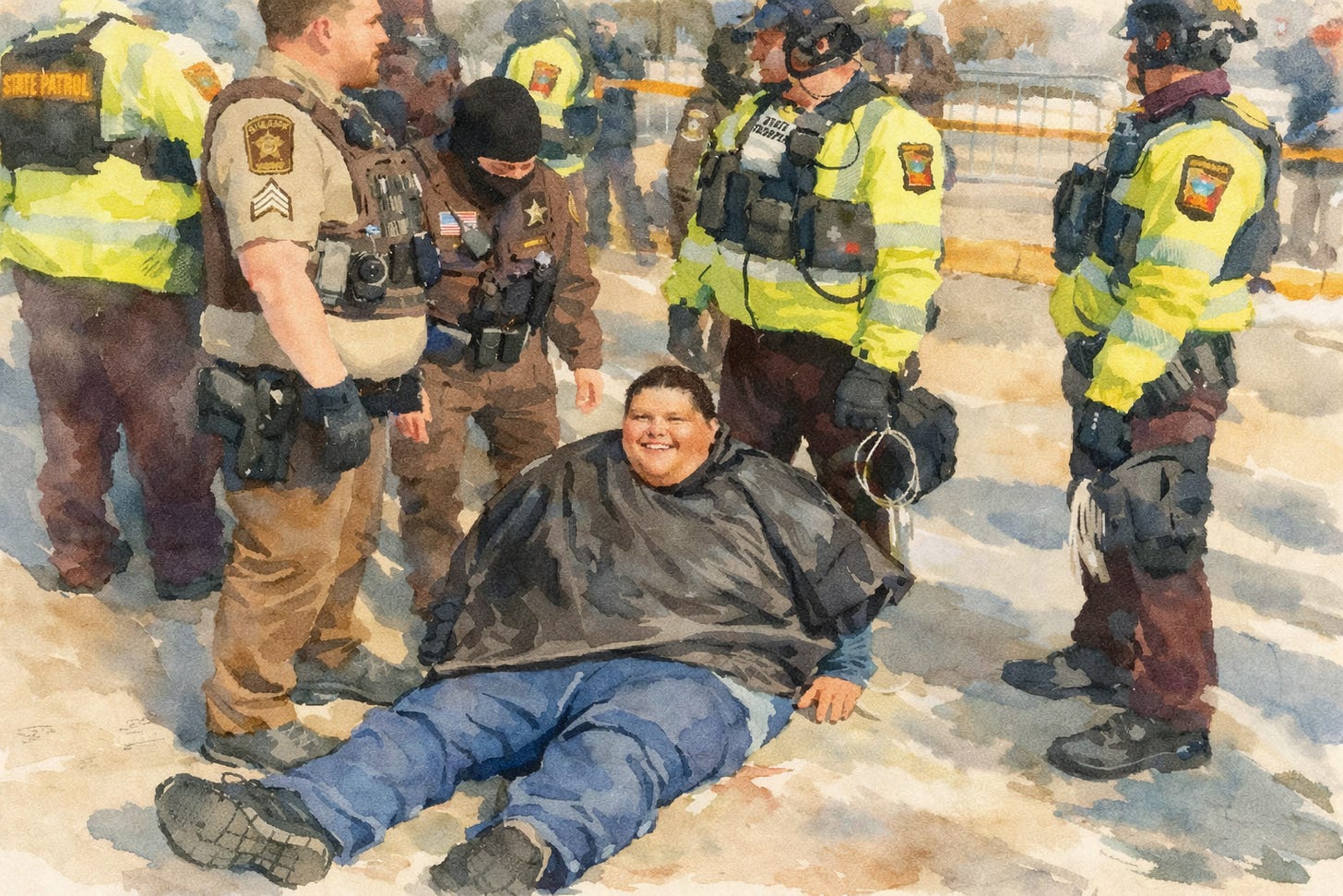 Here were all these officers with their gear and commands and zip ties, completely befuddled by one peaceful young man refusing to make their job easier.